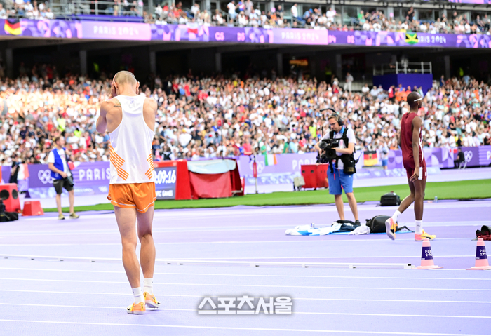 대한민국 육상 높이뛰기 대표 우상혁이 11일(한국 시간) 프랑스 파리 스타드 드 프랑스에서 열린 2024 파리올림픽 육상 남자 높이뛰기 결선에서 2m31을 3차 시기에도 실패한 뒤 아쉬워하고 있다. 2024.8. 11.
