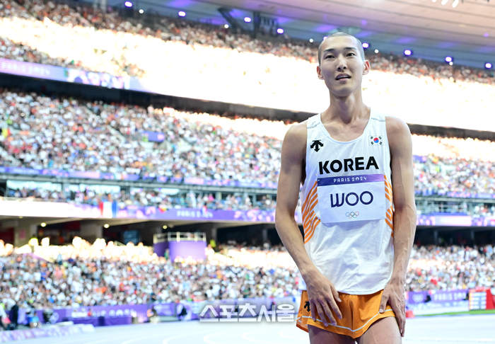 대한민국 육상 높이뛰기 대표 우상혁이 11일(한국 시간) 프랑스 파리 스타드 드 프랑스에서 열린 2024 파리올림픽 육상 남자 높이뛰기 결선에서 2m31을 3차 시기에도 실패한 뒤 아쉬워하고 있다. 우상혁은 최종 7위로 올림픽 메달 도전을 마쳤다. 2024.8. 11.