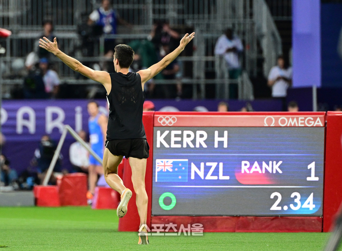 뉴질랜드의 해미시 커가 11일(한국 시간) 프랑스 파리 스타드 드 프랑스에서 열린 2024 파리올림픽 육상 남자 높이뛰기 결선에서 점프 오프 끝에 금메달을 차지한 뒤 그라운드를 뛰어다니며 금메달의 기쁨을 만끽하고 있다. 2024.8. 11.