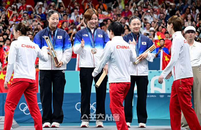 대한민국 탁구 국가대표 신유빈(왼쪽부터), 이은혜, 전지희가 10일(한국 시간) 프랑스 파리 사우스 파리 아레나4에서 열린 2024 파리올림픽 탁구 여자 단체에서 동메달을 딴 뒤 금메달을 차지한 중국 선수들과 인사를 나누고 있다. 2024. 8. 10.