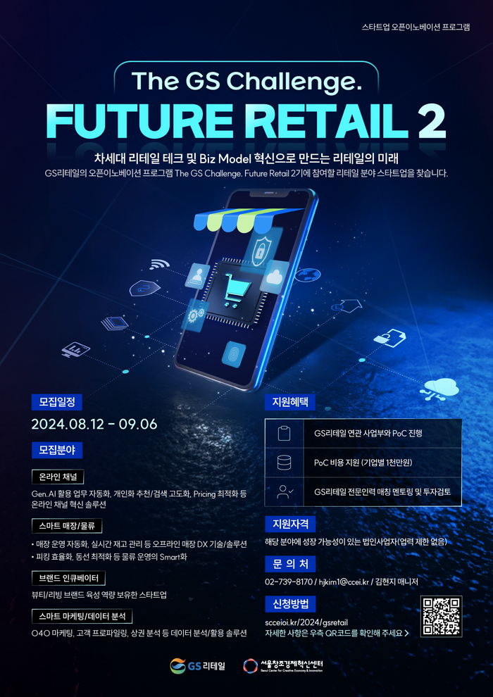 GS리테일이 서울창조경제혁신센터와 협력해 12일부터 9월 6일까지 오픈이노베이션 프로그램 ‘더 지에스 챌린지 퓨처 리테일(The GS Challenge. Future Retail) 2기’에 참여할 스타트업을 모집한다고 밝혔다.