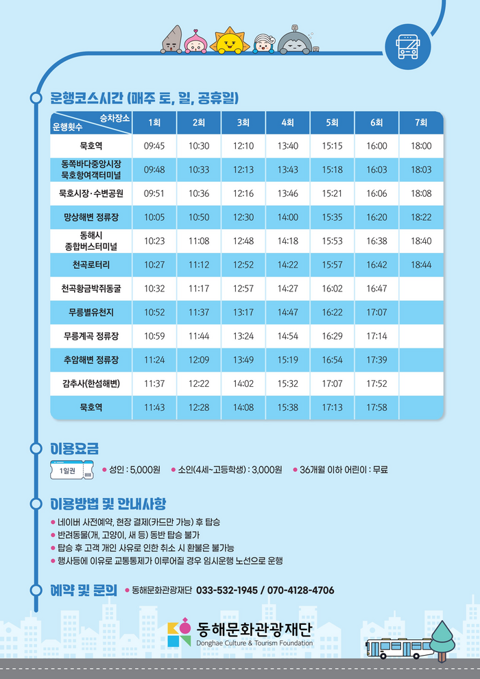 동해시티투어버스는 당일 자유롭게 승하차가 가능한 순환형 버스로 이용요금은 성인 5,000원, 4세~고등학생 3,000원, 36개월 이하는 무료이다.