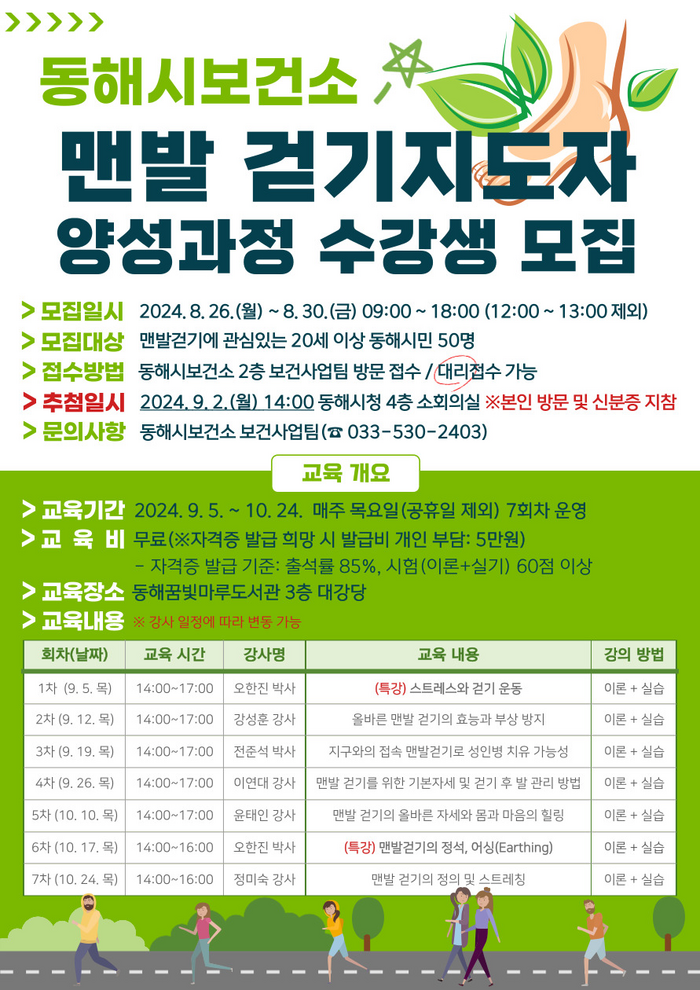 맨발 걷기 지도자 양성과정은 오는 9월 5일부터 10월 24일까지 매주 목요일 총 7회차에 걸쳐 20세 이상 동해시민 50명을 대상으로 운영하며, 오한진 의학박사를 비롯한 전문 강사의 교육으로 올바른 맨발 걷기의 효능과 부상 방지 방법, 맨발 걷기로 성인병 치유 가능성, 맨발 걷기를 위한 기본자세, 걷기 후 발 관리 방법 등 다양한 이론과 실습으로 이뤄진다.