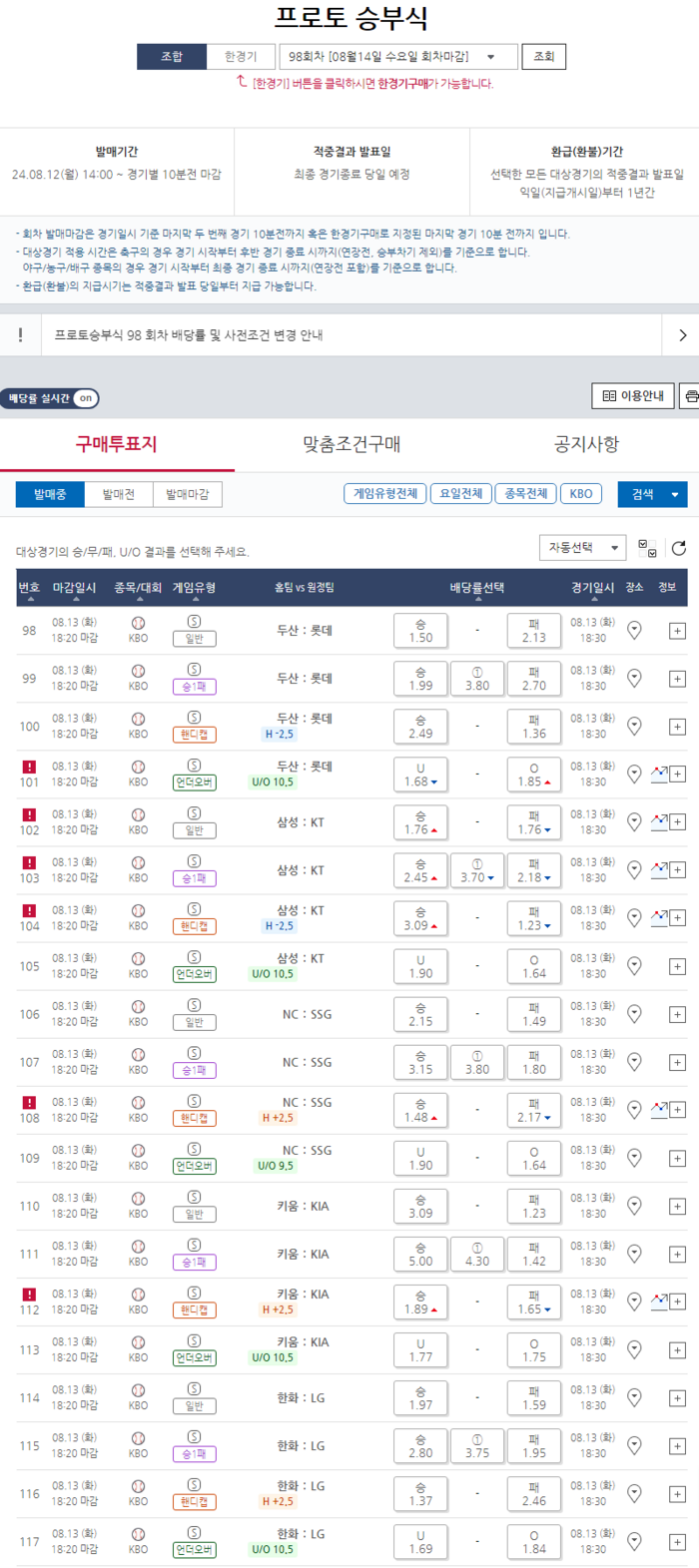 이번 프로토 승부식 98회차에서는 13일(화) 오후 6시 30분에 펼쳐지는 ▲두산-롯데(98~101번) ▲삼성-KT(102~105번) ▲NC-SSG(106~109번) ▲키움-KIA(110~113번) ▲한화-LG(114~117번)전이 대상 경기로 선정됐다.