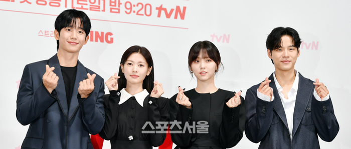 배우 정해인, 정소민, 김지은, 윤지온이 14일 신도림 라마도호텔에서 열린 tvN 새드라마 ‘엄마친구아들’ 제작발표회 무대에 올라 포토타임을 갖고 있다. 연출: 유제원, 출연:정해인, 정소민,김지은,윤지온. 2024.08.14.