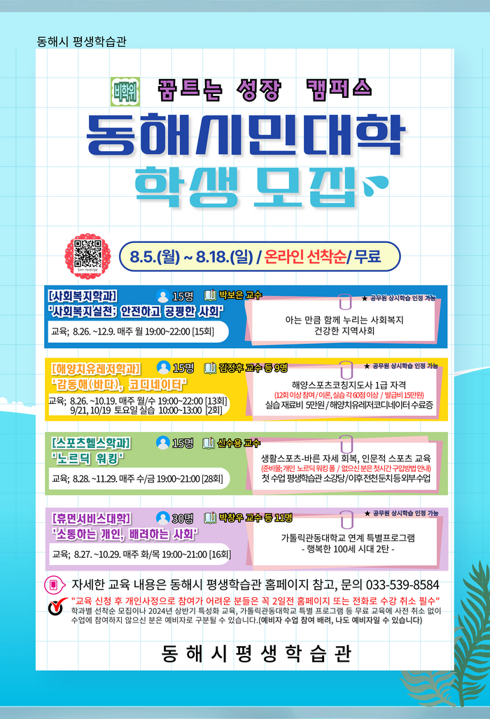 [스포츠서울ㅣ김기원기자]동해시(시장 심규언)가 비학위 동해시민대학 4개 교육 과정을 개설, 오는 18일까지 학생 75명을 선착순 모집한다고 밝혔다.