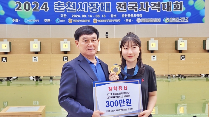 한국중고등학교사격연맹은 15일 춘천시공공사격장에서 반효진에게 장학금 300만원을 전달했다. 중고연맹은 김병은 소속학교 코치에게도 격려금 200만원을 전달했다.