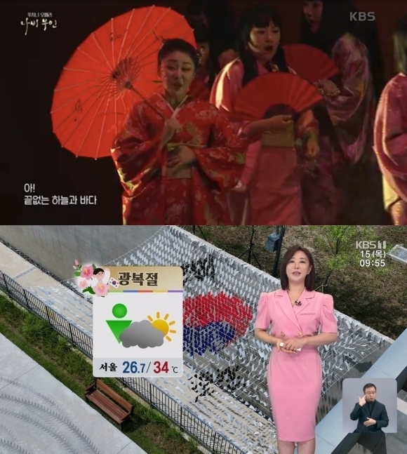 KBS가 15일 0시 광복절이 되자마자 방영한 오페라 ‘나비부인’은 일본에 주둔한 미국인 장교와 일본인 여자의 비극적 사랑을 그린 작품이다. 미국이 일본을 강제 개항시킨 1900년대 일본 나가사키를 배경으로 하고, 주인공은 극 마지막까지 기모노를 입고 등장하며 극 중 주인공 남녀의 결혼식 장면에선 미국국가와 일본국가인 기미가요가 연주된다.