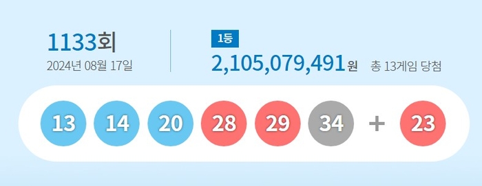 [스포츠서울 | 배우근 기자] 1133회(8월17일) 추첨한 로또 1등 당첨 번호는 ‘13·14·20·28·29·34’이다. 보너스 번호는 ‘23’이다.