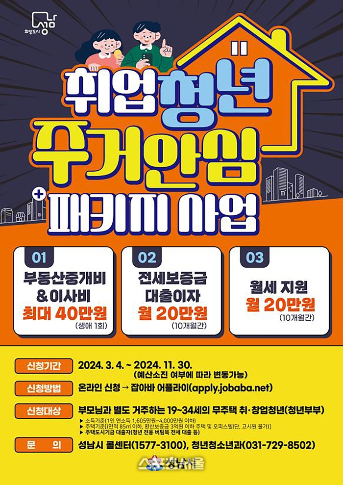 〔스포츠서울│성남=좌승훈기자〕경기 성남시는 ‘취업청년 주거안심 패키지 3종 사업’을 추진 중인 가운데 그 일부인 전세보증금 대출이자 지원 대상을 확대했다고 19일 밝혔다.