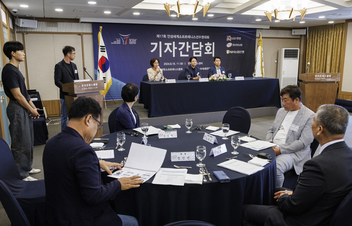 제17회 안성세계소프트테니스 세계선수권 대회 기자 간담회가 19일 서울 중구 프레스센터에서 열렸다. 대한소프트테니스협회 정인선 회장, 남녀 대표팀 김백수(순천시청), 곽필근(안성시청) 감독이 참석했고 선수단 대표로 4명(김범준 김태민 이민선 임진아)이 자리했다.