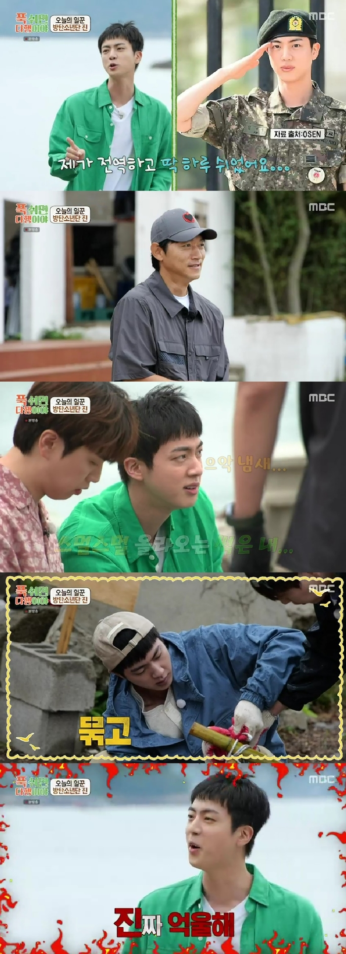 같은 시간 진은 절친인 B1A4 산들과 함께 배에 실려 어떤 운명이 기다리는지 모른 채 섬으로 이동 중이었다. 섬에 발을 딛자마자 짐 풀라는 소리에 진은 “전역하고 딱 하루 쉬었다”라며 어안이 벙벙한 표정을 지었다.