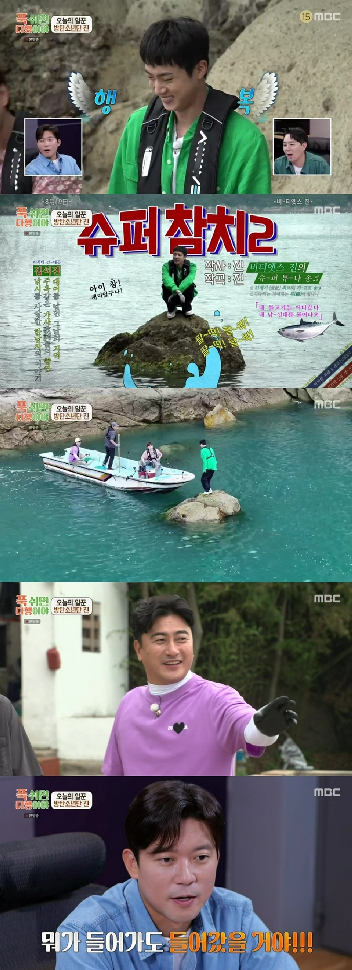 진의 수난은 계속 이어졌다. 노를 젓다가 안정환에게 물을 튀긴 죄로 자그마한 바위 위에 유배돼 폭소를 안겼다. “섬에서는 BTS고 뭐고 없어”라는 안정환의 엄포에 좌절한 진은 구조 후 첫 통발에서 문어를 낚고 기뻐했다.