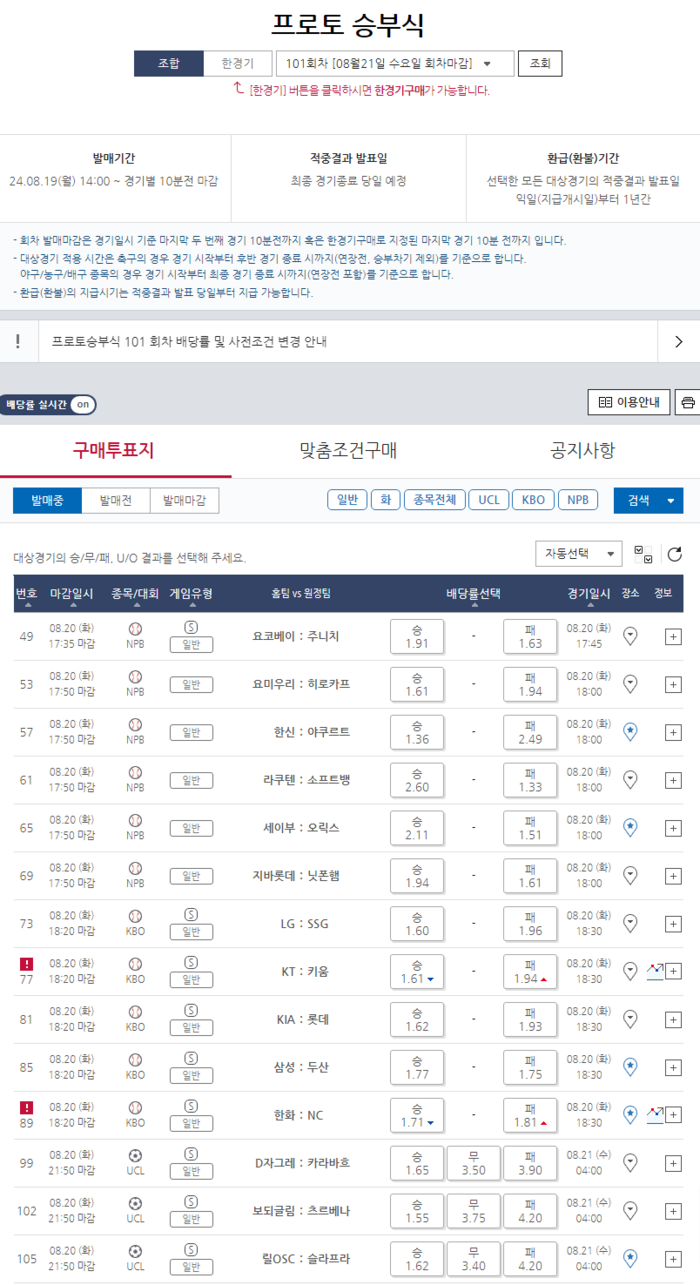 프로토 승부식 101회차는 지난 19일 오후 2시부터 게임을 발매했으며, 이와 관련한 프로토 승부식의 게임 방법 및 경기 분석 내용은 공식 인터넷 발매 사이트 베트맨 내 토토가이드를 참고하면 된다. et16@sportsseoul.com