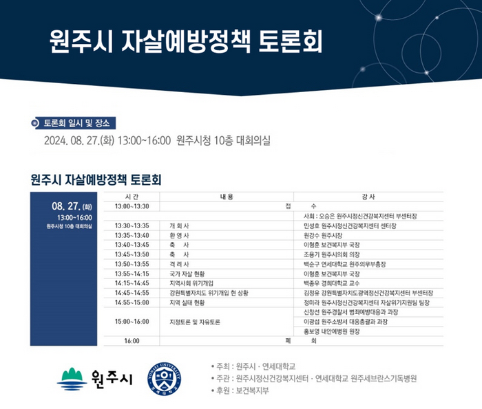 원주시가 주최하고 원주시정신건강복지센터(센터장 민성호)의 주관으로 개최되는 이번 토론회는 원주시의회, 원주경찰서, 원주소방서, 원주세브란스기독병원, 내안에병원 등 관내 유관기관이 참여하여 자살예방 관련 제도, 조직, 정책등을 재정비하고 지역적 특성과 사회변화에 맞는 지역 위기개입의 현 상황을 논의하며 유관기관과 네트워크를 강화하기 위해 추진됐다.