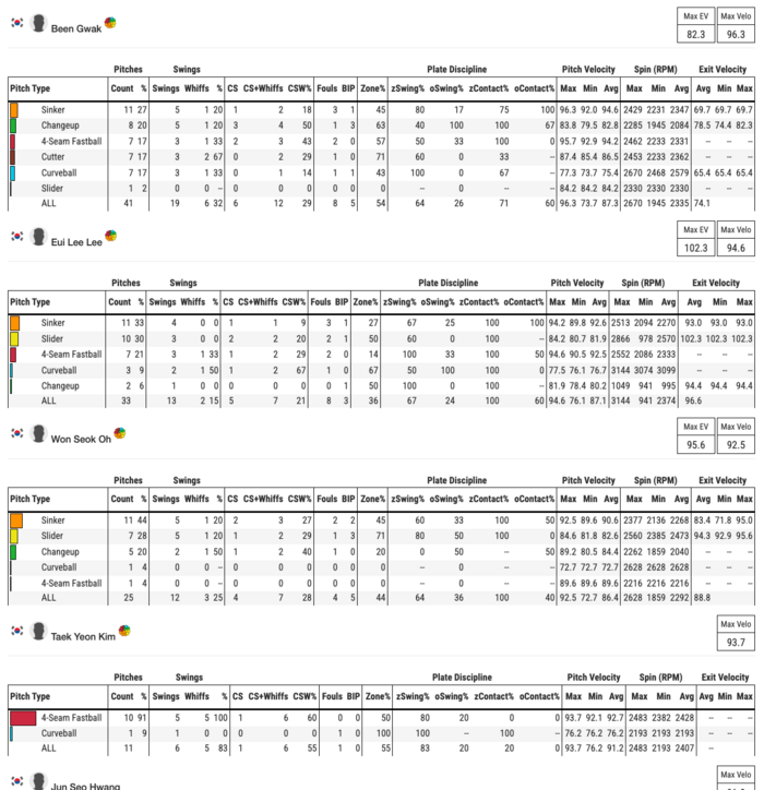 3월19일 LA 다저스와 맞붙은 김택연은 속구 RPM 평균 2428을 기록했다. ML 기준에서도 상위권인 회전수다. 이의리는 속구 RPM 최고 2513을 찍었다. 좌투수로서 속구 RPM 2500 이상은 빅리그에서도 흔치 않다.