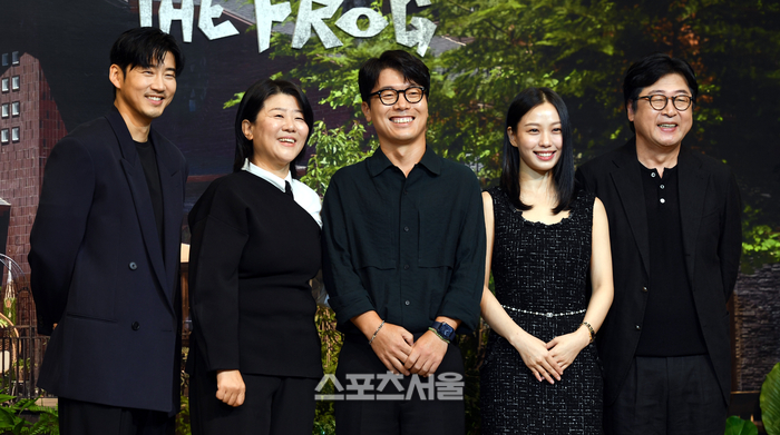 윤계상, 이정은, 모완일 감독, 고민시, 김윤석(왼쪽부터)이 21일 서울 강남 조선팰리스 호텔에서 열린 넷플릭스 오리지널 시리즈 ‘아무도 없는 숲속에서’ 제작발표회에서 포토타임을 갖고 있다.