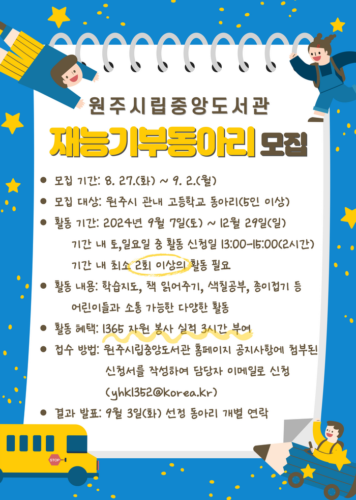 [스포츠서울ㅣ원주=김기원기자]원주시립중앙도서관은 8월 27일부터 2024년 하반기 청소년 재능기부 봉사활동에 참여할 관내 고등학교 동아리 학생들을 모집한다.