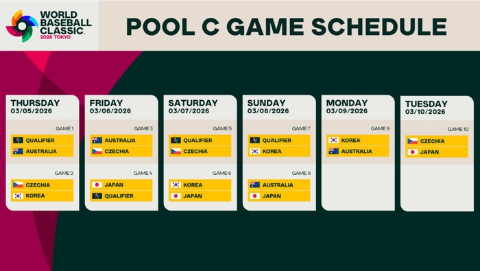 메이저리그(ML) 사무국은 22일(한국시간) “2026년 3월 5일부터 일본 도쿄돔에서 열릴 월드베이스볼클래식(WBC) C조에 한국과 일본 호주 체코가 편성됐다”고 밝혔다. AP통신은 “쿠바와 푸에르토리코 파나마 캐나다가 A조, 미국을 비롯해 멕시코 이탈리아 영국이 B조, 도미니카공화국 베네수엘라 네덜란드 이스라엘이 D조로 각각 편성됐다”고 전했다.