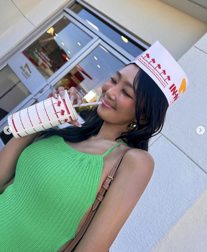머리엔 인앤 아웃 버거 모자를 쓰고 음료를 든 모습의 사진도 선보여 한껏 재밌는 표정을 지어보이기도 했다.