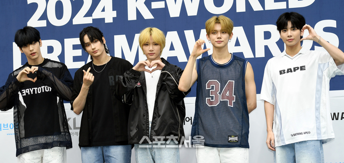 투모로우바이투게더가 22일 서울 잠실실내체육관에서 열린 ‘2024 케이 월드 드림 어워즈’ 블루카펫 및 포토월 행사에서 포즈를 취하고 있다.