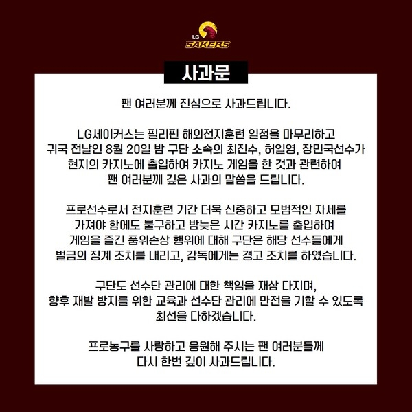 사과문을 올린 LG는 “구단도 선수단 관리에 대한 책임을 재삼 다지며, 향후 재발 방지를 위한 교육과 선수단 관리에 만전을 기할 수 있도록 최선을 다하겠다. 프로농구를 사랑하고 응원해 주시는 팬 여러분들께 다시 한번 깊이 사과드린다”라고 덧붙였다.