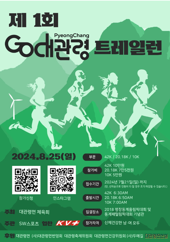 [스포츠서울ㅣ김기원기자]평창군 대관령면체육회(회장 하태순)가 주최하고, SW스포츠(대표 박병주)가 주관하는 제1회 GO 대관령 트레일런 대회가 8월 25일 오전 5시 30분, 평창군 대관령면에서 개최된다.