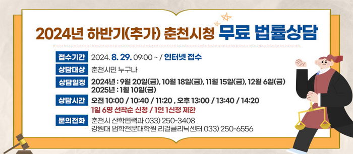 예약 가능한 하반기 무료법률상담 상담일은 9월 20일, 10월 18일, 11월 15일, 12월 6일, 2025년 1월 10일이며, 1일 6명 선착순으로 신청이 마감된다.