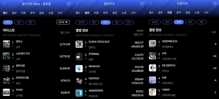한터차트의 8월 4주 차 주간 차트 집계 기간은 지난 19일부터 25일까지다. 월드차트는 음반, 음원, 인증, SNS, 미디어 등 케이팝 아티스트의 글로벌 데이터를 바탕으로 집계, 발표되며, 음반차트 순위는 전 세계 음반 판매량을 바탕으로 한 음반 지수를 기준으로 발표된다. 인증차트는 해외 팬들의 정품 음반 인증량을 기준으로 한다.