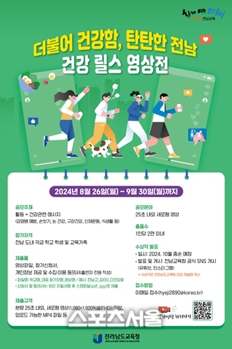 [스포츠서울|조광태기자] 전라남도교육청(교육감 김대중)은 26일부터 다음달30일까지 ‘더불어 건강함, 탄탄한 전남’ 건강 릴스 영상공모전을 운영한다.