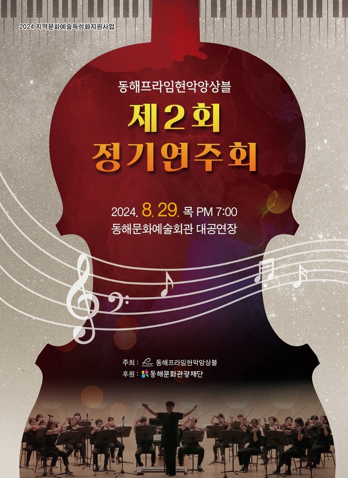 8월 29일 오후 7시에 동해문화예술회관 대공연장에서 동해프라임현악앙상블이 주최하는 ‘제2회 정기 연주회’가 열린다. 이번 연주회는 지역 문화예술을 발전하고 현악기 고유의 감성적인 음악을 시민과 공유하는 시간을 갖게 한다.