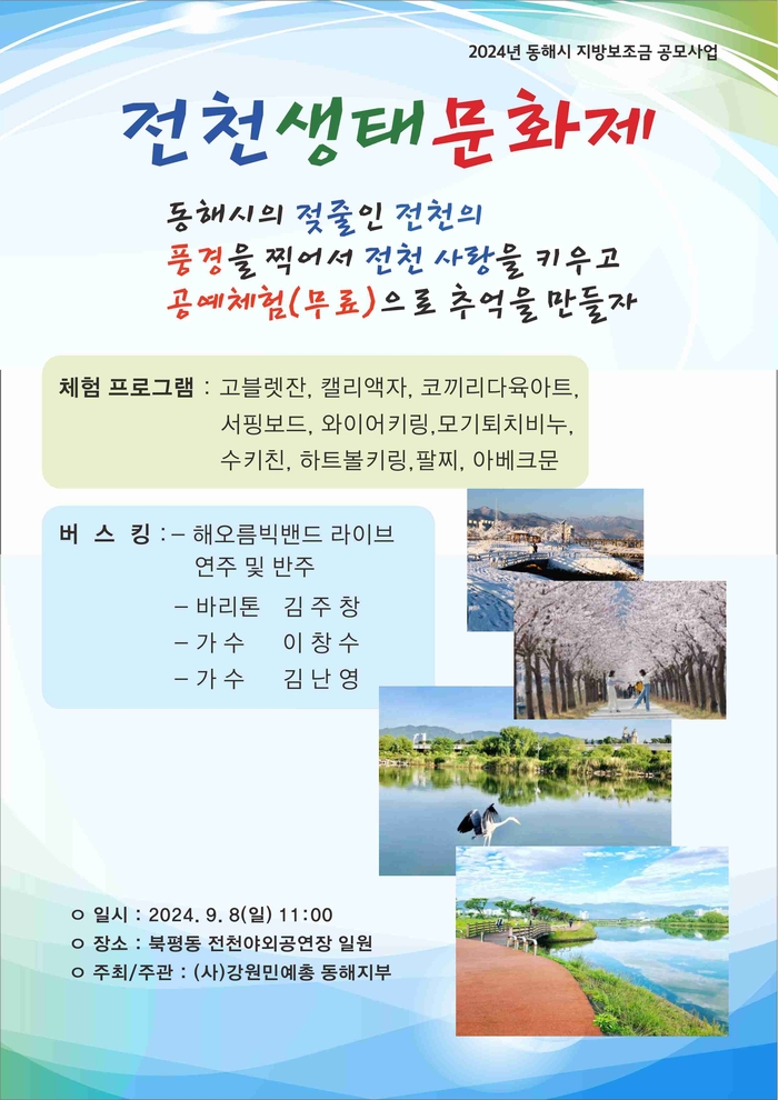 ‘전천 생태 문화제’가 9월 8일 오전 11시부터 전천야외공연장 일원에서는 고블렛잔, 캘리액자, 와이어키링 등 다양한 체험 프로그램과 버스킹이 동해시의 젖줄 전천을 배경으로 열린다. 또한, 이번 행사가 시민에게 전천의 생태적 가치를 널리 알리고자 한다.