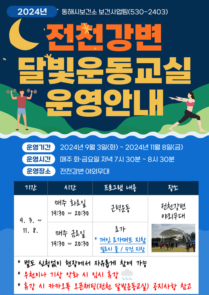 [스포츠서울ㅣ김기원기자]동해시(시장 심규언)는 올해 상반기 시민들의 뜨거운 반응으로 큰 인기를 얻은 전천강변 달빛운동교실이 하반기(9월~11월)에도 운영한다고 밝혔다.