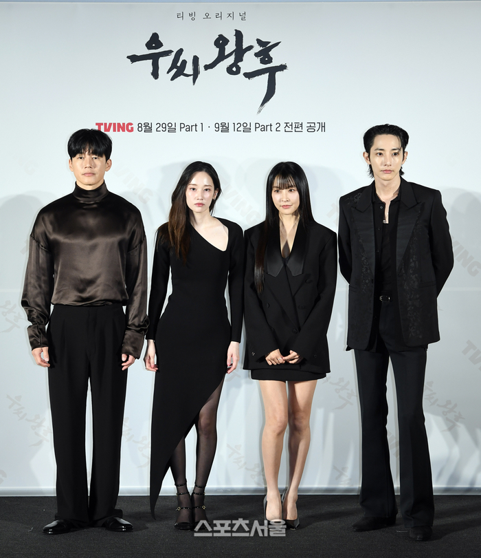 배우 김무열(왼쪽부터), 전종서, 정유미, 이수혁이 27일 서울 용산구 아이파크몰 CGV에서 진행된 티빙 오리지널 시리즈 ‘우씨왕후’ 제작발표회에서 취재진을 향해 포즈를 취하고 있다.