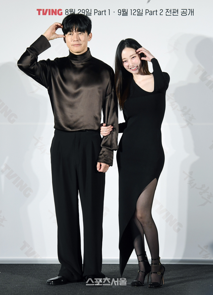 배우 김무열(왼쪽)과 전종서가 27일 서울 용산구 아이파크몰 CGV에서 진행된 티빙 오리지널 시리즈 ‘우씨왕후’ 제작발표회에서 취재진을 향해 포즈를 취하고 있다.