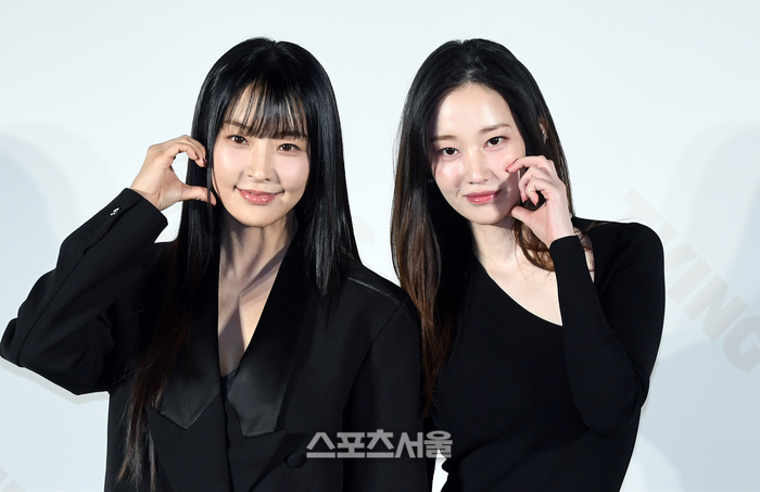 배우 정유미(왼쪽)와 전종서가 27일 서울 용산구 아이파크몰 CGV에서 진행된 티빙 오리지널 시리즈 ‘우씨왕후’ 제작발표회에서 취재진을 향해 포즈를 취하고 있다.