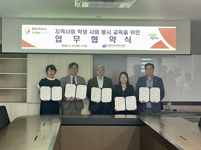 [스포츠서울ㅣ춘천=김기원기자]강원특별자치도춘천교육지원청(교육장 허남호)은 27일(화) 11시 춘천교육지원청에서 지역 5개 기관과 학생 사회봉사 교육을 위한 업무협약을 맺었다.