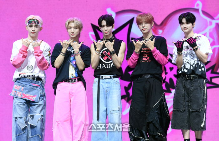 나우어데이즈(NOWADAYS)가 27일 서울 광진구 예스24 라이브홀에서 열린 두 번째 싱글 앨범 ‘NOWHERE’ 발매 기념 미디어 쇼케이스에서 취재진을 향해 포즈를 취하고 있다. 왼쪽부터 현빈, 연우, 시윤, 진혁, 윤. 2024. 8. 27.