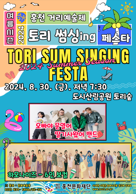 [스포츠서울ㅣ김기원기자](재)홍천문화재단(이사장 전명준)은 8월 30일 (금) 저녁 7시 30분에 도시산림공원 토리숲 야외무대에서 ’홍천 거리예술제 여름시즌 토리 썸싱ing 페스타‘를 개최한다.