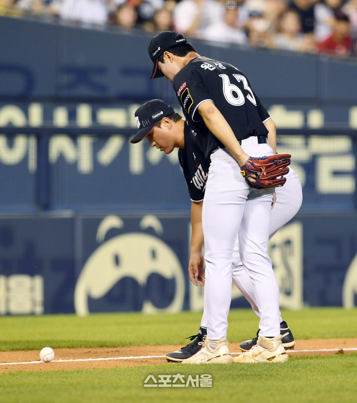 KT 투수 원상현(왼쪽)과 3루수 황재균이 28일 잠실구장에서 열린 2024 KBO리그 LG와 경기 3회말 1사 LG 신민재의 번타 안타 때 타구가 파울라인을 벗어나기를 기다리고 있다. 2024. 8. 28.