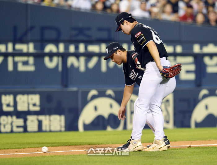 KT 투수 원상현(왼쪽)과 3루수 황재균이 28일 잠실구장에서 열린 2024 KBO리그 LG와 경기 3회말 1사 LG 신민재의 번타 안타 때 타구가 파울라인을 벗어나기를 기다리고 있다. 2024. 8. 28.