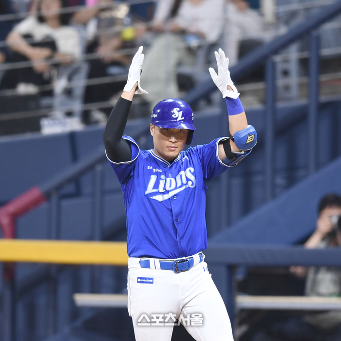 삼성 이병헌이 28일 고척 스카이돔에서 열린 2024 KBO리그 키움과 경기 5회초 무사1,2루 1타점 좌중간 안타를 날린 후 세리머니를 하고 있다.