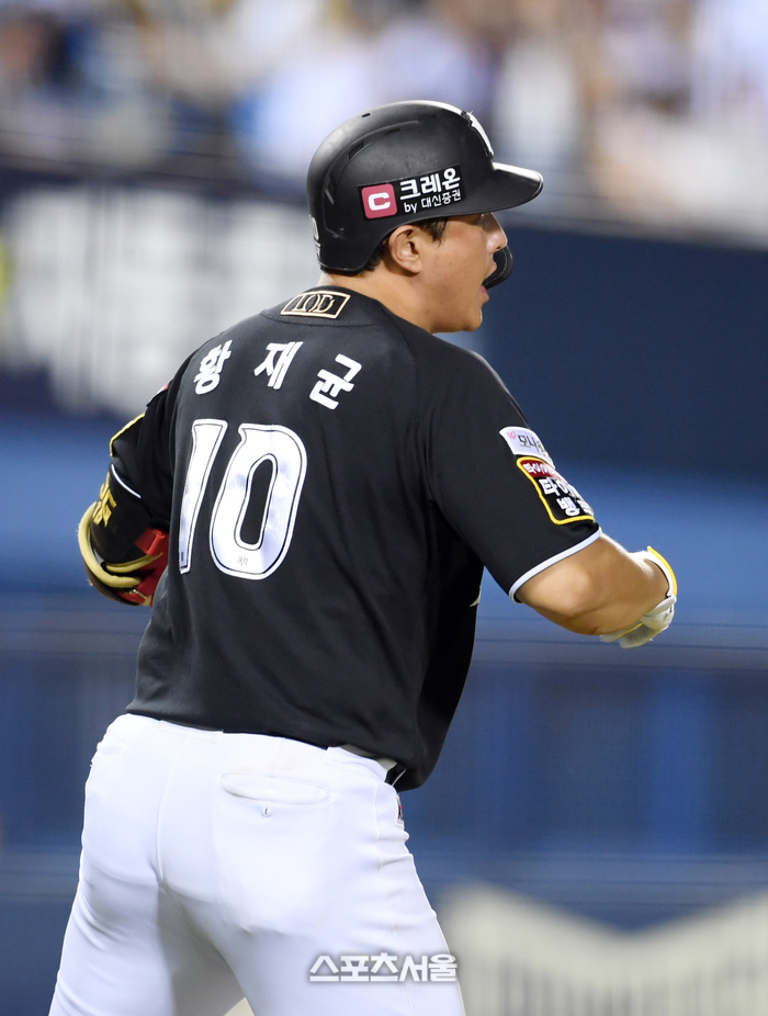 KT 황재균이 28일 잠실구장에서 열린 2024 KBO리그 LG와 경기 8회초 2사 1루 상황에서 LG 김진성을 상대로 동점 2점 홈런을 친 뒤 기뻐하고 있다. 2024. 8. 28.