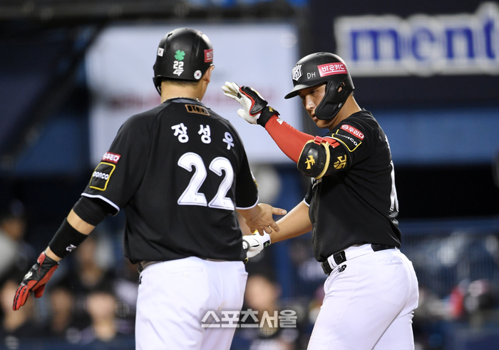 KT 황재균이 28일 잠실구장에서 열린 2024 KBO리그 LG와 경기 8회초 2사 1루 상황에서 LG 김진성을 상대로 동점 2점 홈런을 친 뒤 선해주자 장성우와 하이파이브를 하고 있다. 2024. 8. 28.
