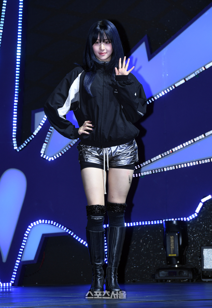르세라핌(LE SSERAFIM)의 허윤진이 29일 서울 광진구 예스24 라이브홀에서 진행된 네 번째 미니 앨범 ‘크레이지(CRAZY)’ 발매 기념 미디어 쇼케이스에서 취재진을 향해 포즈를 취하고 있다. 2024. 8. 29.