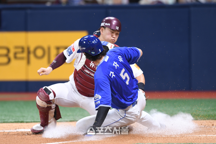 삼성 구자욱이 29일 고척 스카이돔에서 열린 2024 KBO리그 키움과 경기 3회초 2사2루 디아즈 우전안타 때 홈으로 파고들었지만 아웃되고 있다. 상대 포수는 김건희.