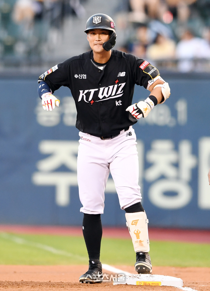 KT 배정대가 29일 잠실구장에서 열린 2024 KBO리그 LG와 경기 1회초 2사 만루 상황에서 LG 선발 손주영을 상대로 2타점 적시타를 친 뒤 세리머니를 하고 있다. 2024. 8. 29.
