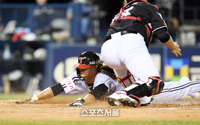 LG 이영빈(왼쪽)이 29일 잠실구장에서 열린 2024 KBO리그 KT와 경기 4회말 1사 1-3루 상황 신민재의 1루 땅볼에 3루에서 홈으로 파고들어 득점을 하고 있다. 2024. 8. 29.