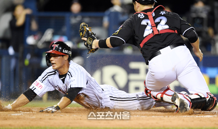 LG 이영빈(왼쪽)이 29일 잠실구장에서 열린 2024 KBO리그 KT와 경기 4회말 1사 1-3루 상황 신민재의 1루 땅볼에 3루에서 홈으로 파고들어 득점을 하고 있다. 2024. 8. 29.