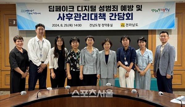[스포츠서울|조광태기자] 전라남도는 텔레그램에 기반한 불법합성물(딥페이크) 성범죄가 전방위적으로 벌어지면서 딥페이크 성범죄 영상물 피해자 지원을 위해 29일 도청 정약용실에서 전남도경찰청, 1366전남센터, 디지털 성범죄 상담소, 시군, 전남도의회 등과 간담회를 개최했다.